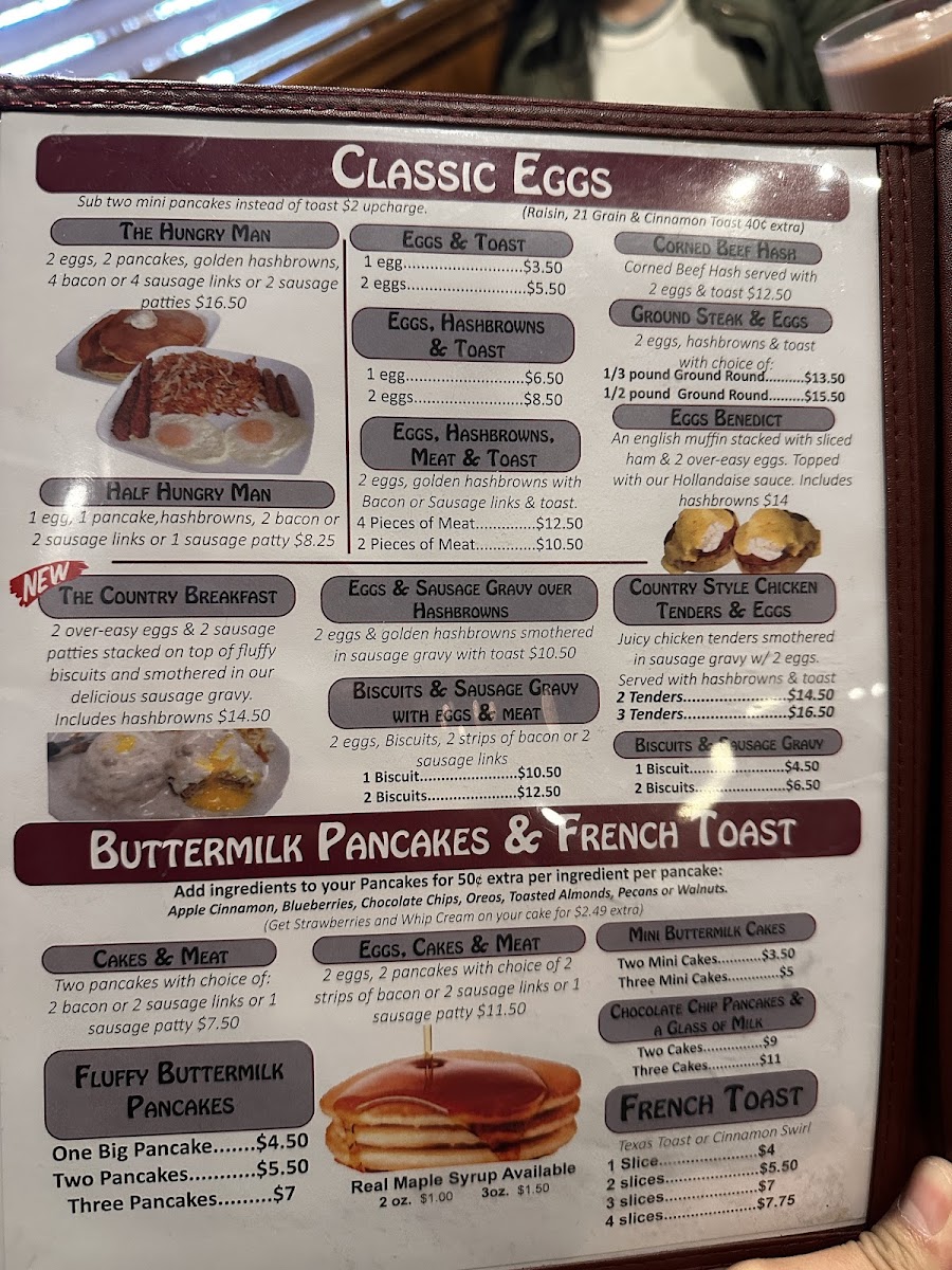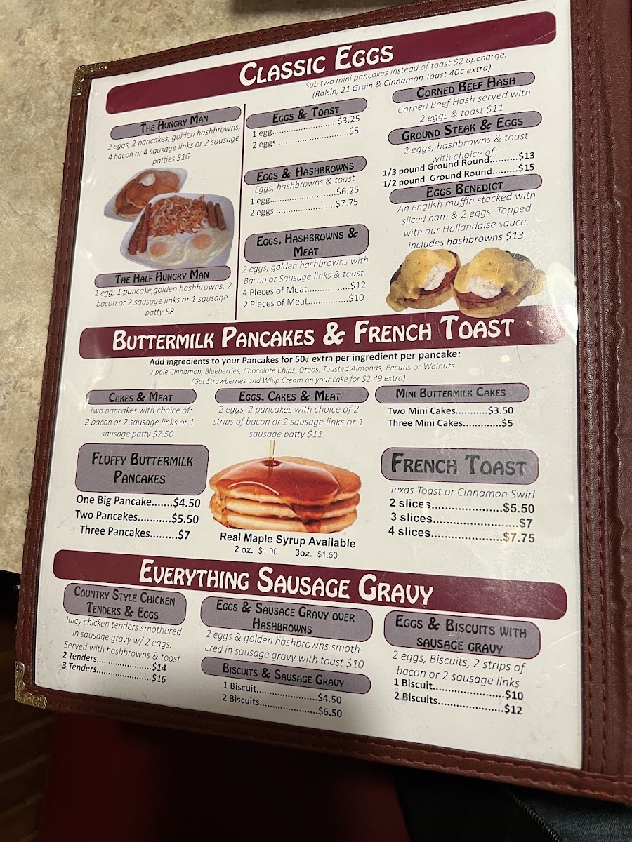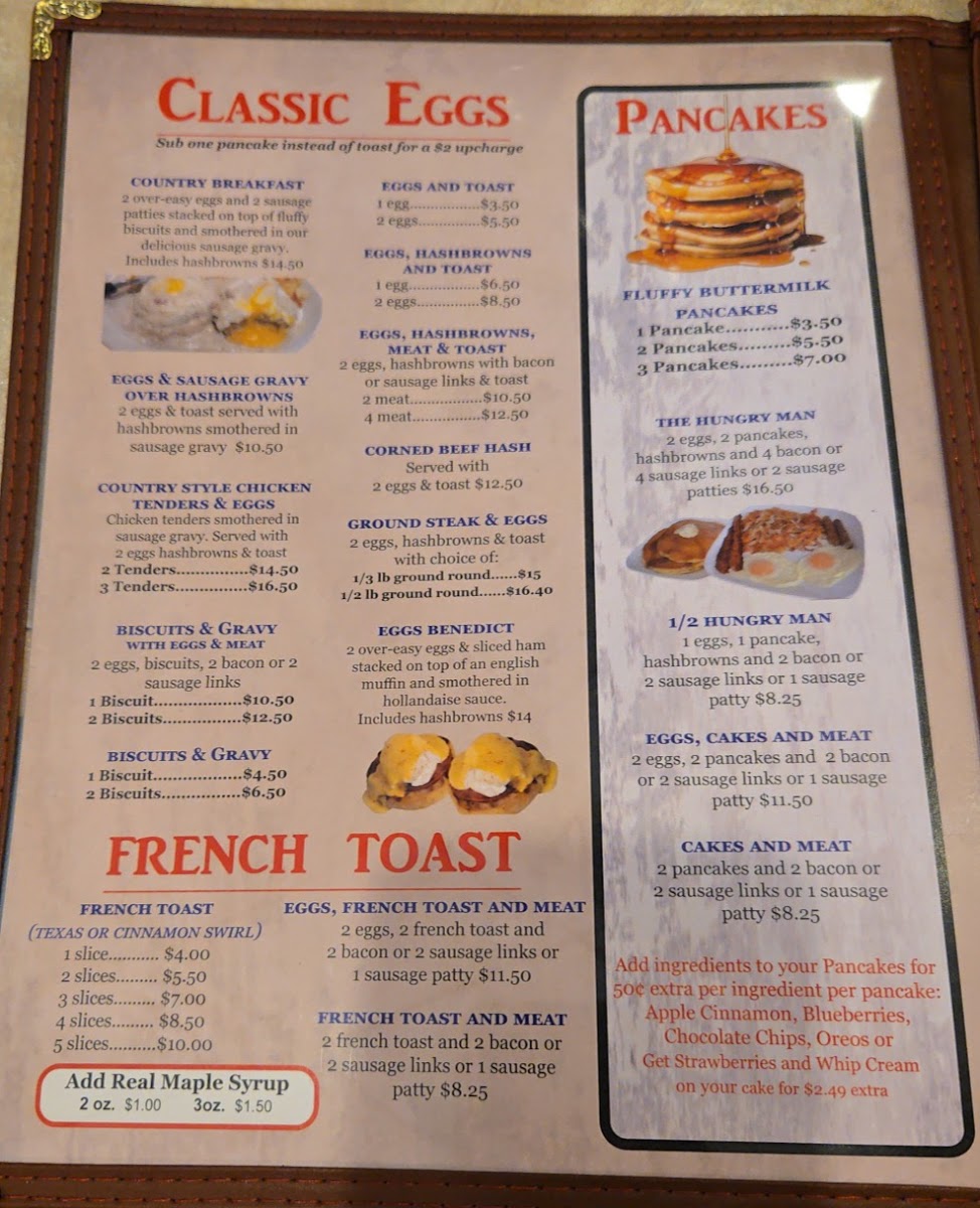 2 eggs, 2 pancakes (or 2 french toast), golden hashbrowns, 4 bacon or 4 sausage links.